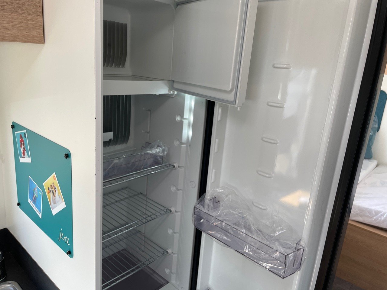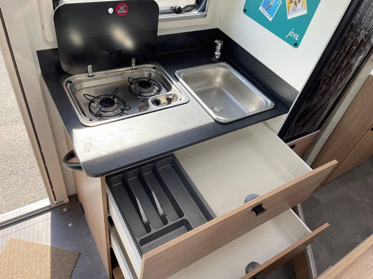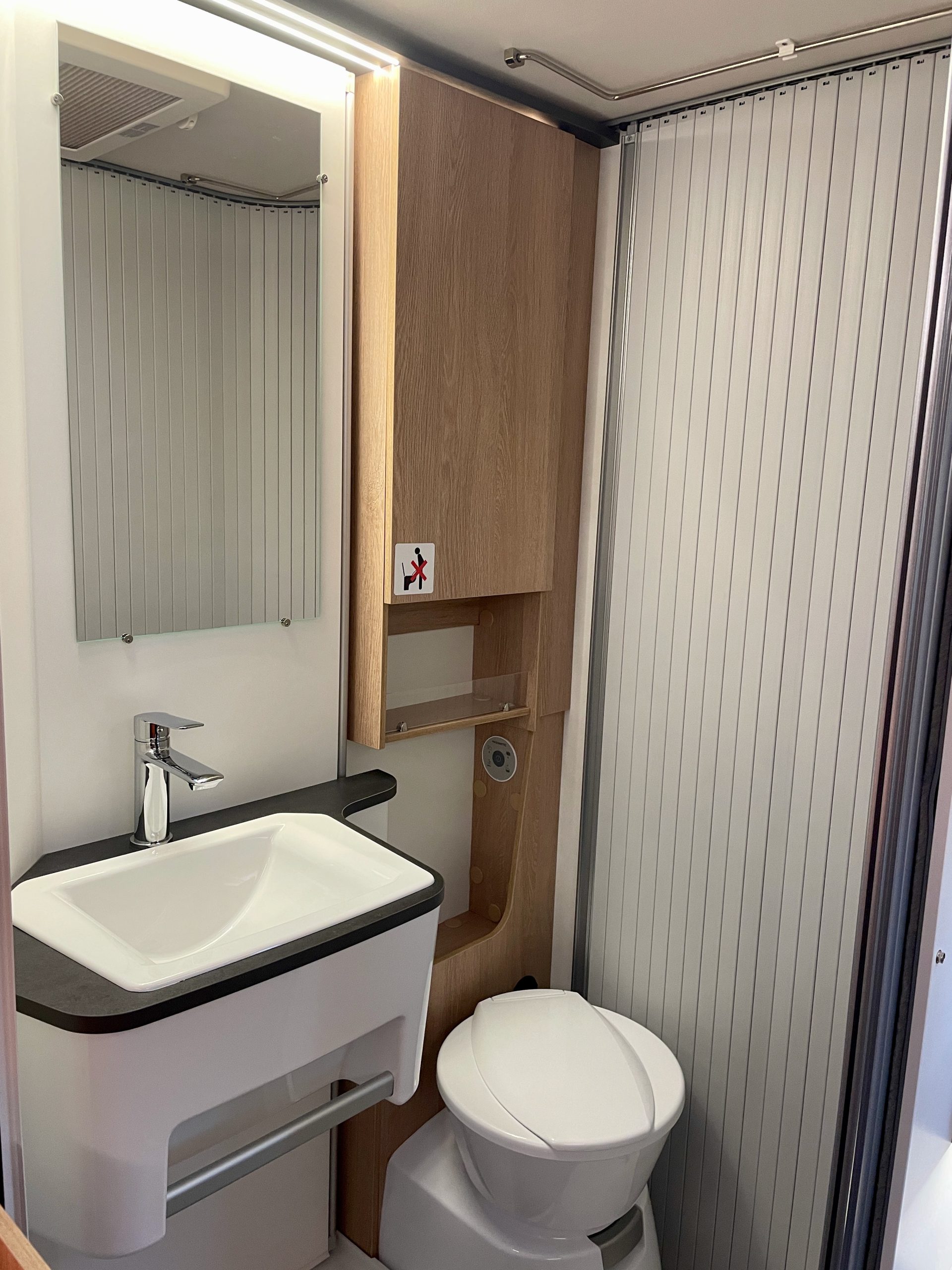 Die Bordküche bietet alles, was es benötigt. Im Heck ist das grosszüfige Badezimmer aufgeteilt auf eine Dusche und ein Badezimmer mit WC. Das Modell bietet grosszügig Stauraum für Gepäck und Campingausrüstung in Einbauschränken innerhalb des Fahrzeugs sowie in der Heckgarage.