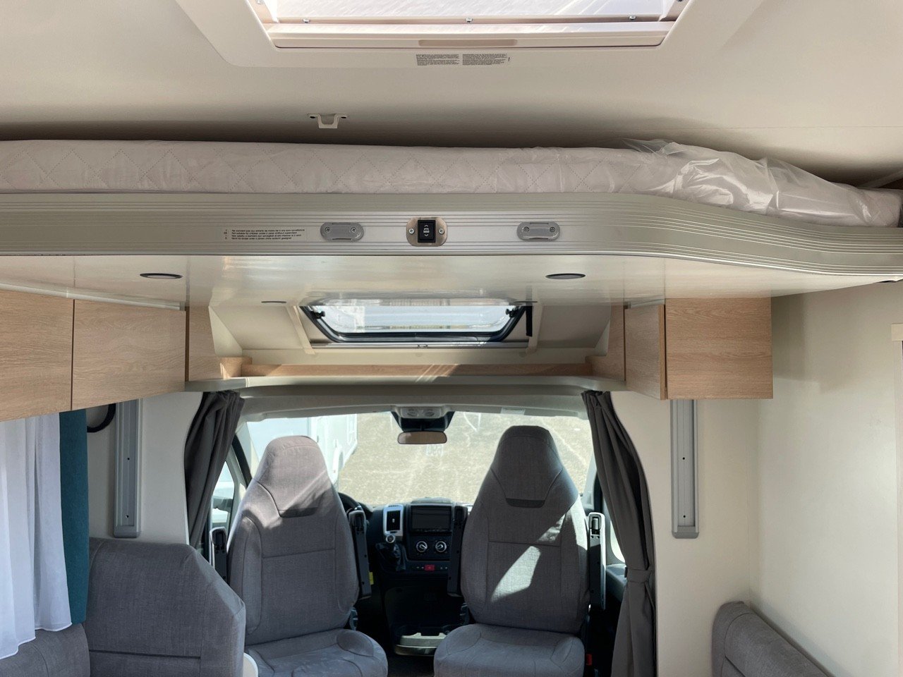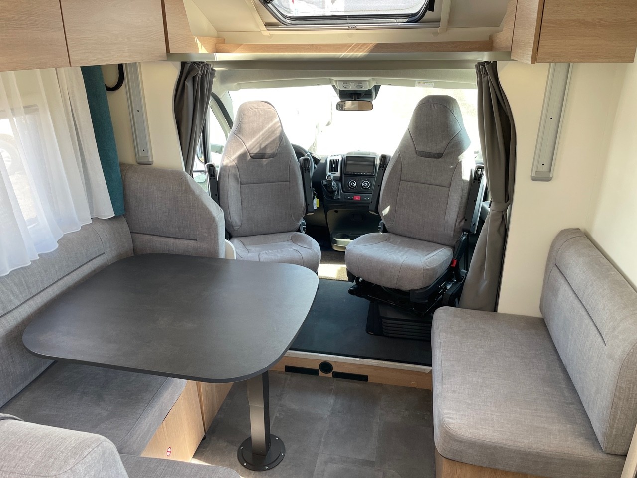Dieses teilintegrierte Fahrzeug ist mit seiner Länge von 7.4 Metern gut dimensioniert. Die Schlafplätze ergeben sich aus zwei Längsbetten im Heck und einem Hubbett oberhalb des Tisches.